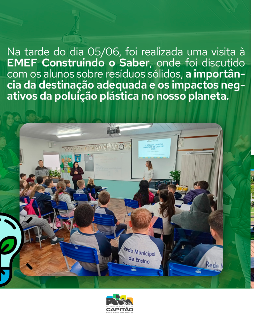 De 05/06 a 11/06, o Departamento do Meio Ambiente promoveu uma semana repleta de atividades educativas, envolvendo alunos, servidores municipais e a comunidade em ações de preservação ambiental.