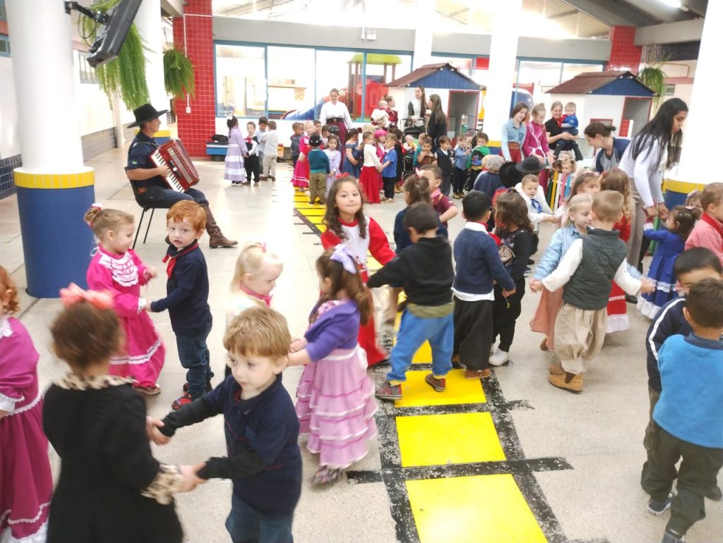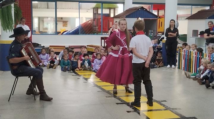 A programação incluiu rodas de chimarrão, degustação de comidas típicas, contação de histórias sobre as tradições locais e a exploração sensorial do cultivo e da textura da erva-mate. As crianças também participaram de danças tradicionais ao som da gaita, com a presença do gaiteiro convidado, Gabriel, e a dança do pezinho apresentada pela Gabrieli e pelo Yuri.