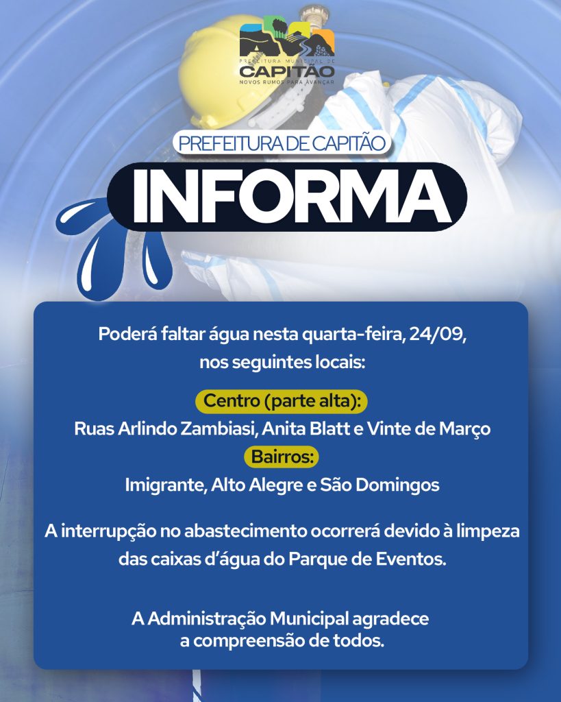 ⚠ A Administração Municipal informa que poderá faltar água nesta quarta-feira, 24 de setembro, nos seguintes locais: