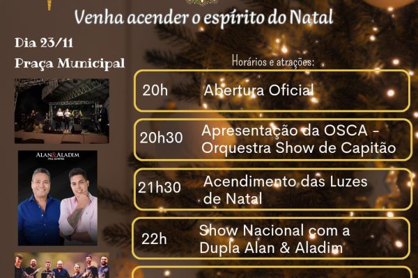 A magia do Natal já está tomando conta de Capitão! No próximo sábado, 23 de novembro, a partir das 19h, a Praça Municipal será palco de um evento inesquecível, que promete encantar moradores e visitantes de todas as idades.