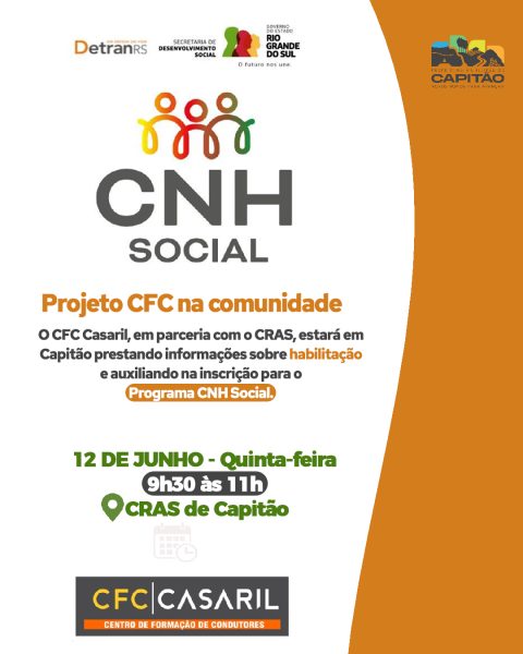 Nesta quarta-feira (12), o CFC Casaril, em parceria com o Centro de Referência de Assistência Social (CRAS), estará no município de Capitão para prestar informações e auxiliar na inscrição do Programa CNH Social. O atendimento ocorrerá das 9h30 às 11h, no CRAS de Capitão.