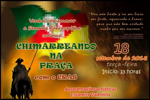 A Administração Municipal, através do CRAS, estará realizando no dia 18 de setembro, próxima terça-feira, um encontro de integração, denominado “Chimarreando na Praça”. O evento terá início às 13 horas, com apresentações artísticas gauchescas dos grupos do CRAS, muita música gaúcha e a presença da Ervateira Valentina, que fornecerá erva-mate e água quente para o chimarrão. Em caso de mau tempo, o evento acontecerá no Ginásio do Clube Esportivo Sete de Setembro, com a mesma programação e horários.