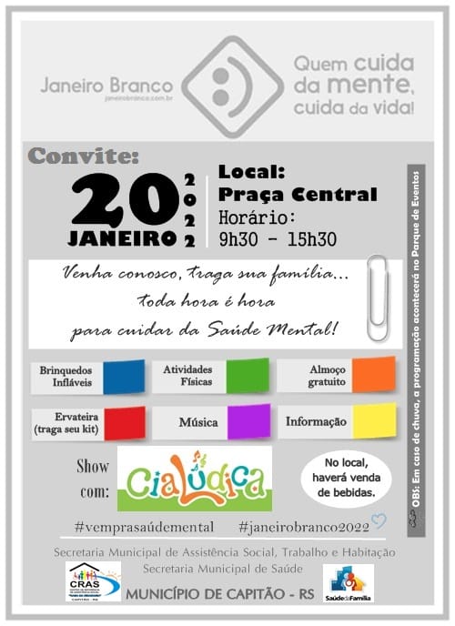 Convidamos todos para participarem da programação que acontecerá no dia 20 de janeiro na praça municipal de Capitão. Parcerias CRAS e Secretaria Municipal de Saúde. Você é nosso convidado especial!