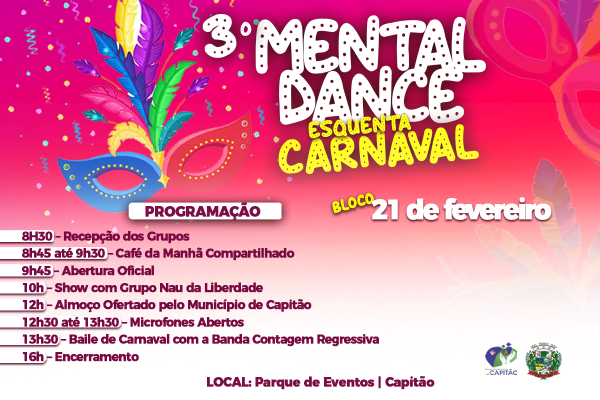 A Prefeitura de Capitão, por meio da Secretaria Municipal de Saúde, tem a alegria de anunciar o III Mental Dance – Esquenta Carnaval, um evento regional dedicado à promoção da saúde mental, com alegria, música e integração! Contando com uma programação especial, com Show com o Grupo Nau da Liberdade, almoço ofertado pelo município de Capitão e baile de Carnaval com a Banda Contagem Regressiva. Será um dia repleto de alegria, diversão e momentos de convivência, fortalecendo laços e celebrando a vida!
