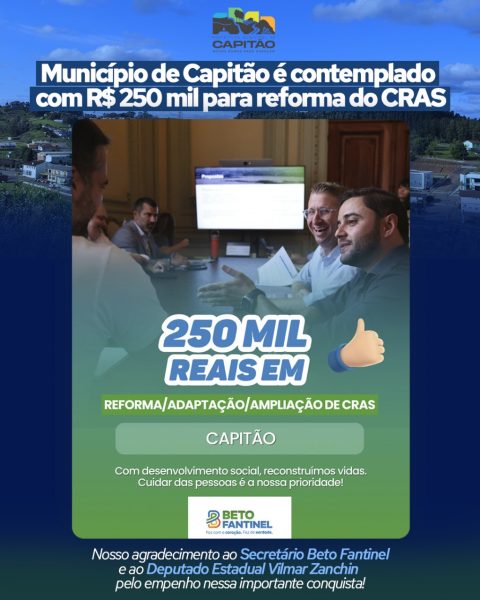 O Município de Capitão foi contemplado com um repasse de R$ 250.000,00 (duzentos e cinquenta mil reais) para a reforma do prédio do Centro de Referência de Assistência Social – CRAS. O recurso é proveniente do cofinanciamento do Piso Gaúcho, no âmbito do Programa Avançar SUAS – Reconstrução.