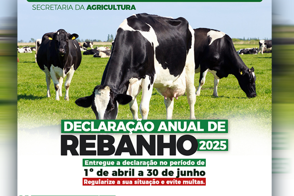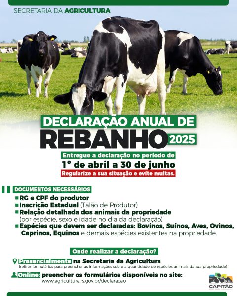 A Prefeitura de Capitão informa que, de 1° de abril a 30 de junho de 2025, estará aberto o prazo para a Declaração Anual de Rebanho, documento obrigatório para todos os produtores rurais do Rio Grande do Sul que possuam animais. A declaração é essencial para a regularização da atividade pecuária no município.